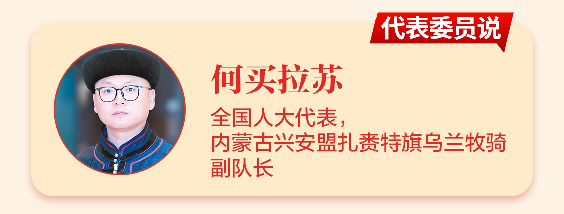 “作为铸牢中华民族共同体意识的践行者和传播者,多年来,扎赉特旗乌兰牧骑以传递党的声音和关怀为己任,通过歌舞、戏剧小品、长调、呼麦等艺术形式,展示各族人民团结奋进和对美好生活的追求,唱出北疆儿女感党恩、听党话、跟党走的共同心声。”全国人大代表、内蒙古自治区兴安盟扎赉特旗乌兰牧骑副队长何买拉苏说。