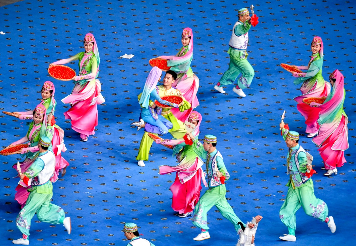 在第十二届全国少数民族传统体育运动会开幕式上,宁夏代表团的运动员表演《和美宁夏 我们共同的家》。宁夏日报记者 王晓龙 摄