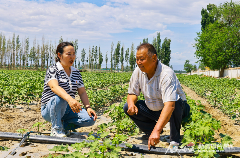 吴文秀(左)在伊吉林莫墩村的棉田内查看节水灌溉情况。受访者供图