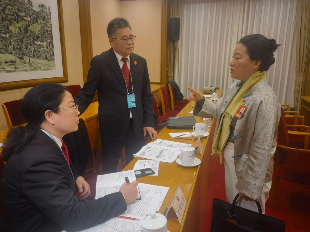 3月9日,陕西代表团分组审议现场,全国人大代表、陕西师范大学西北历史环境与经济社会发展研究院副院长方兰与现场旁听的最高人民法院工作人员就设立法治副校长信箱建议深入交流。新华社记者 韩洁 摄