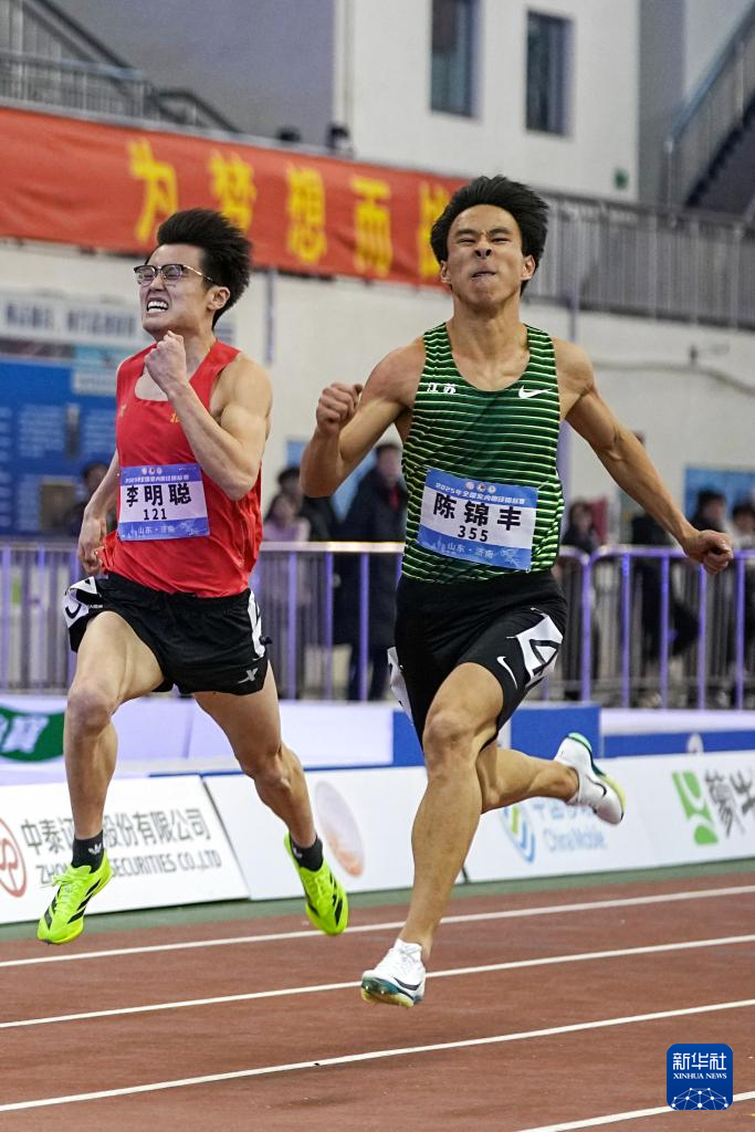 3月9日,江苏队选手陈锦丰(右)在男子200米决赛中。他以21秒11的成绩获得冠军。