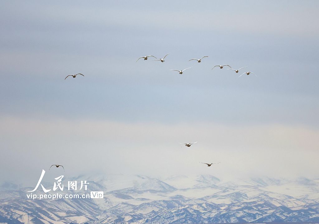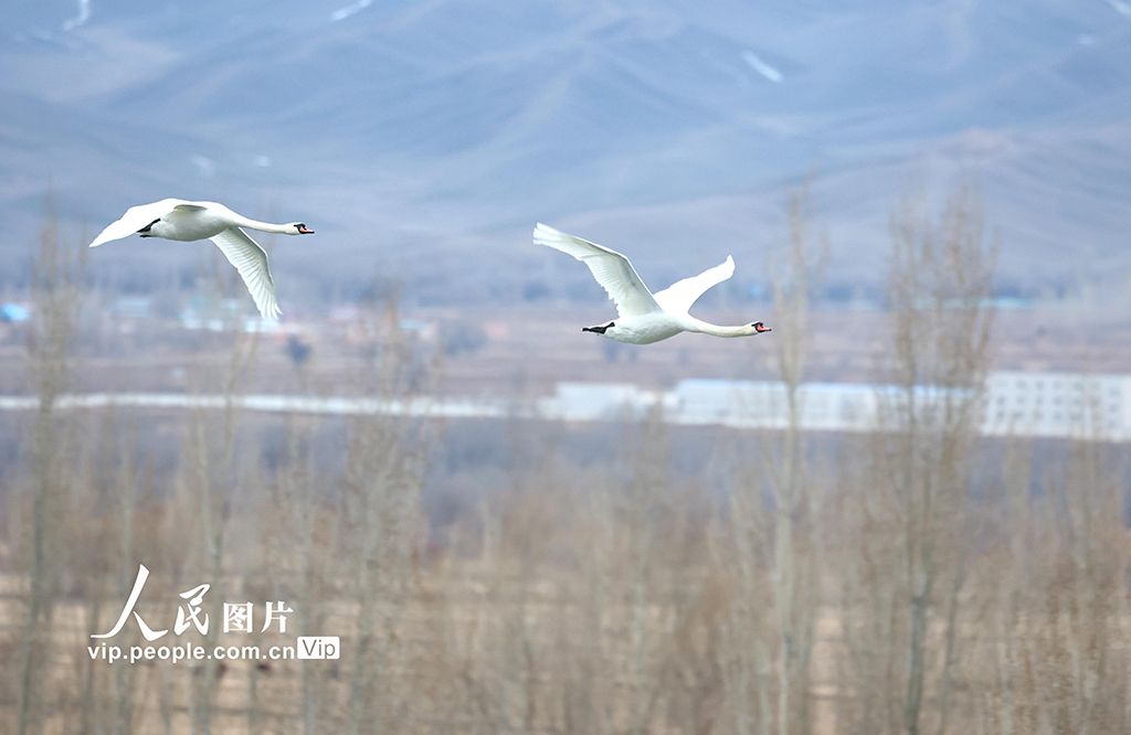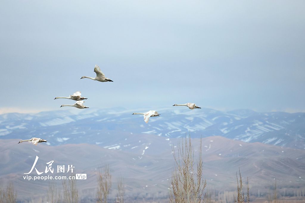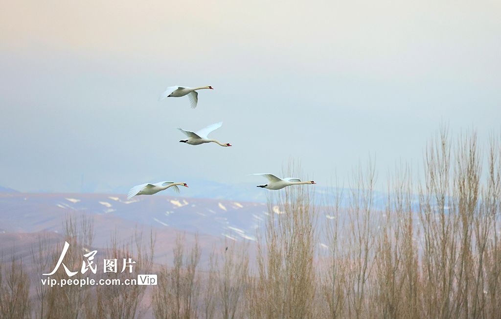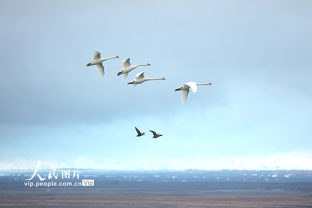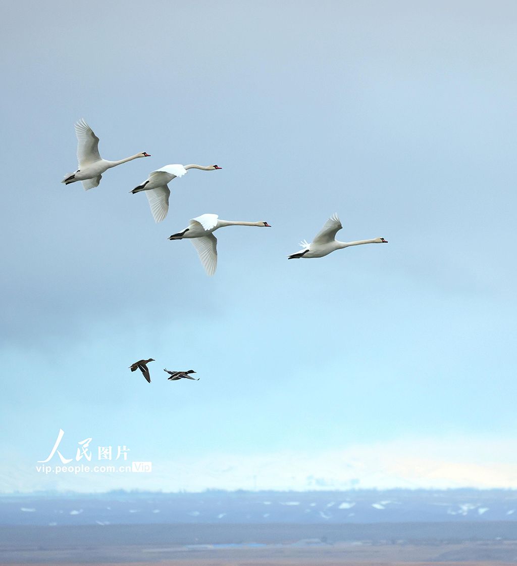 2025年3月10日,在新疆伊犁哈萨克自治州伊宁县的天鹅泉湿地公园内,一群优雅的天鹅正展翅飞翔于蔚蓝的天空之下,构成一幅令人心旷神怡的自然画卷。柴更利摄(人民图片网)