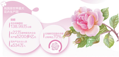 我国已成为世界最大的花卉生产国。中国花卉协会的统计数据显示,全国花卉种植面积138.99万公顷,观赏苗木、切花和盆栽植物、种球的生产面积均位居世界前列。我国还是全球最大的康乃馨、百合切花生产国,以及第二大月季和菊花切花生产国。花卉产业从业人员超534万人,其中花农近180万户。我国现有近22万家种苗花卉企业,年产值5200多亿元。
