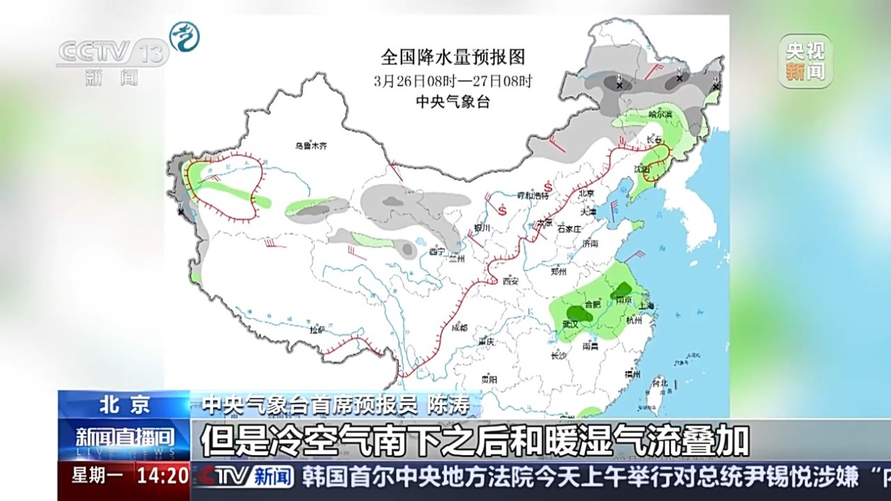 中央气象台首席预报员 陈涛:北方地区的雨雪天气相对来说就比较分散,主要是在新疆、内蒙古以及东北地区将会出现小到中雨雪或者是雨夹雪的天气,但是冷空气南下之后和暖湿气流叠加,从26日以后,南方的大部分地区将会出现小到中雨或者雷阵雨,局部地区可能还是要防范可能出现的雷暴大风或者冰雹等强对流天气。
