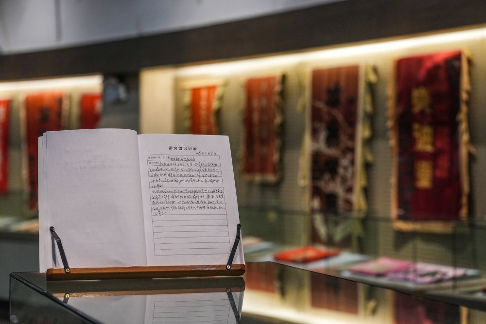 在辽宁省锦州市辽沈战役纪念馆拍摄的参观者留言簿(2025年4月1日摄)。来自中国医科大学的参观者在留言中写下“赓续红色基因、传承红色血脉”。