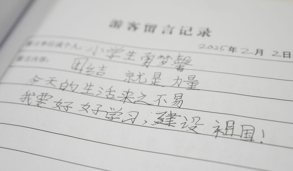 2025年4月1日,锦州市一名小学生在参观辽宁省锦州市辽沈战役纪念馆后,在留言簿上留下感想。