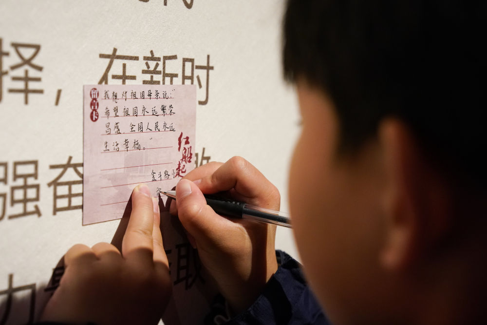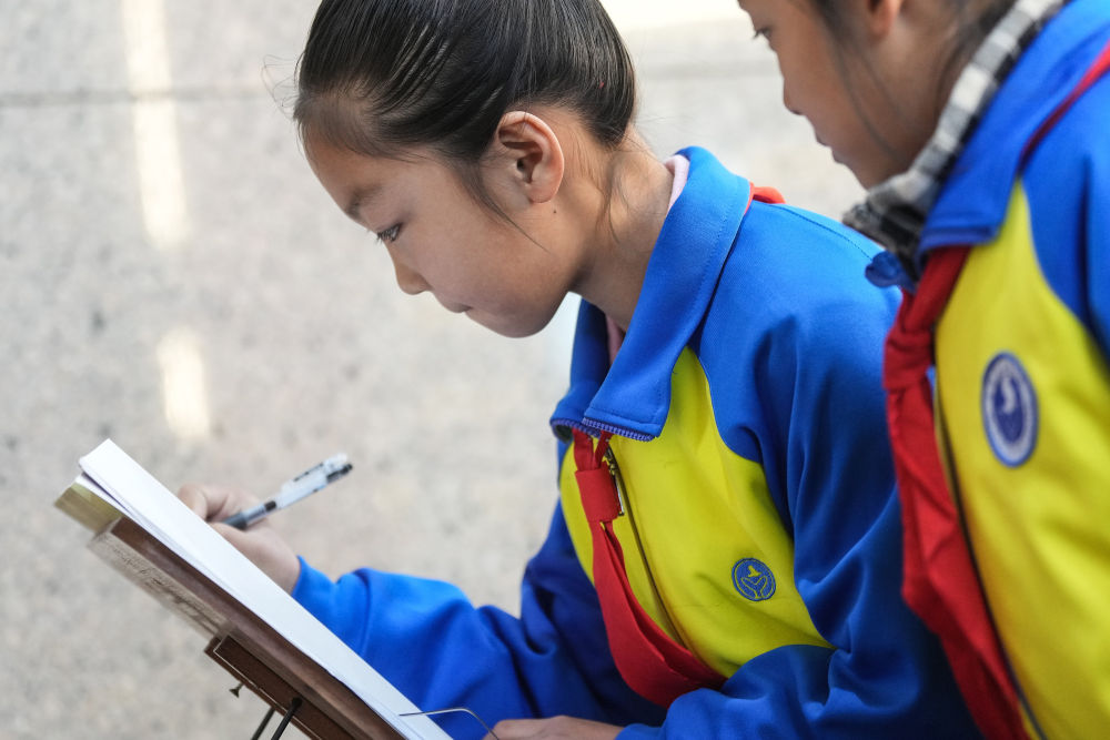 2025年3月27日,安徽省合肥市金斗路小学的学生在渡江战役纪念馆书写留言卡。