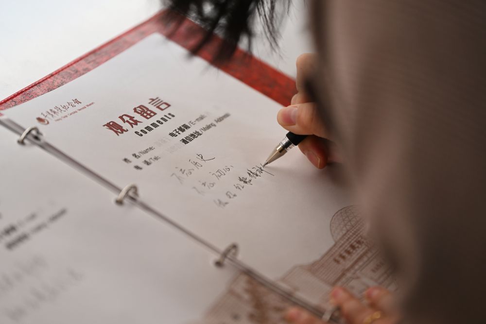 2025年3月31日,参观者在江苏省徐州市淮海战役纪念馆留言簿上留言。