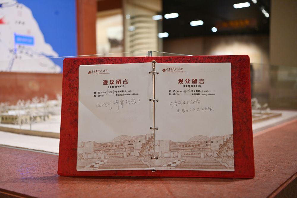 这是2025年3月27日拍摄的平津战役纪念馆观众留言簿。一名观众写下“向我们的前辈致敬!”