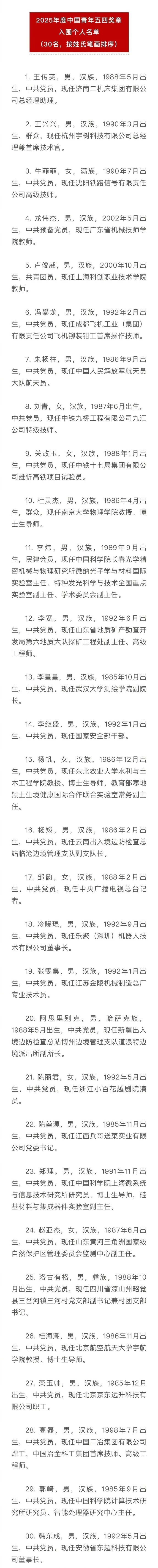 据共青团中央消息,2025年度中国青年五四奖章入围名单公示。其中,宇树科技创始人王兴兴、浙江小百花越剧院演员陈丽君、航天员朱杨柱和桂海潮、总台记者邹韵等人在列。