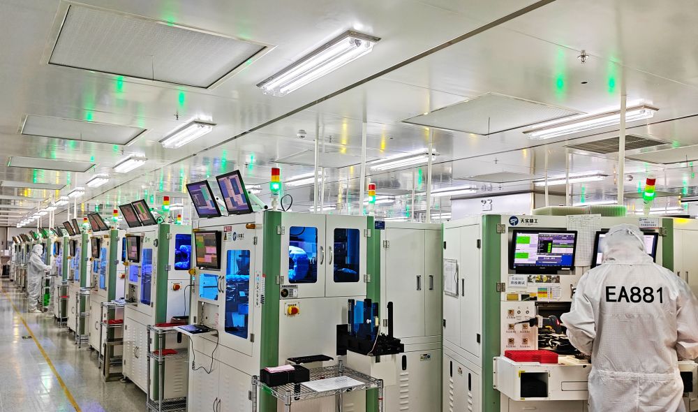 4月3日在重庆市天实精工科技有限公司无尘车间拍摄的摄像头模组自动化生产作业现场。新华社发(田浩良摄)