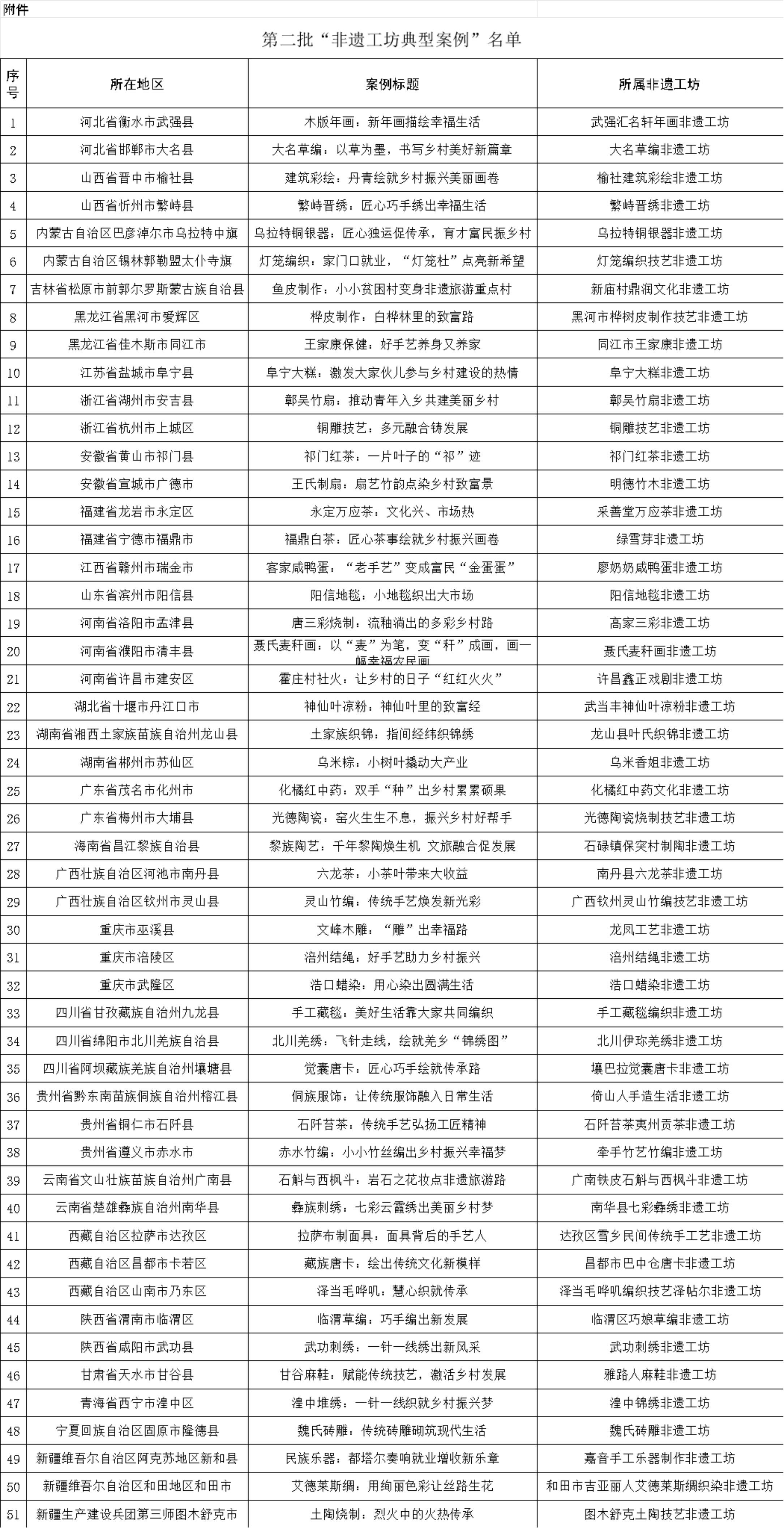 央视网消息:据文化和旅游部网站消息,根据《文化和旅游部办公厅 人力资源社会保障部办公厅 农业农村部办公厅关于推荐第二批“非遗工坊典型案例”的通知》安排,文化和旅游部、人力资源社会保障部、农业农村部组织开展了第二批“非遗工坊典型案例”(以下简称“典型案例”)推荐工作,在各地积极申报的基础上,经研究遴选并经公示,确定了51个典型案例,现将名单予以公布。