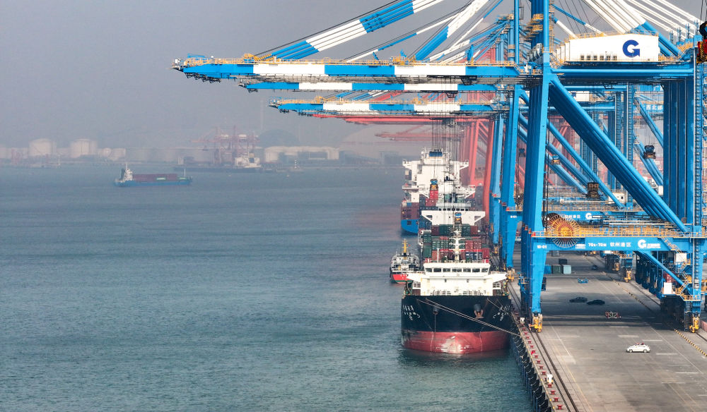2024年12月31日,远洋货轮在钦州港集装箱自动化码头排队卸货(无人机照片)。新华社记者 吕帅 摄