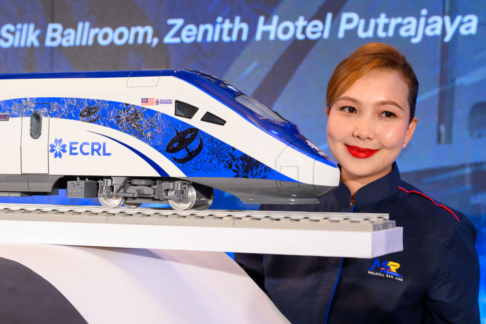2024年12月18日,在马来西亚普特拉贾亚,模特与新的动车组模型合影。新华社发(张纹综摄)