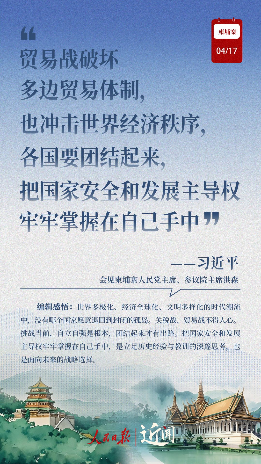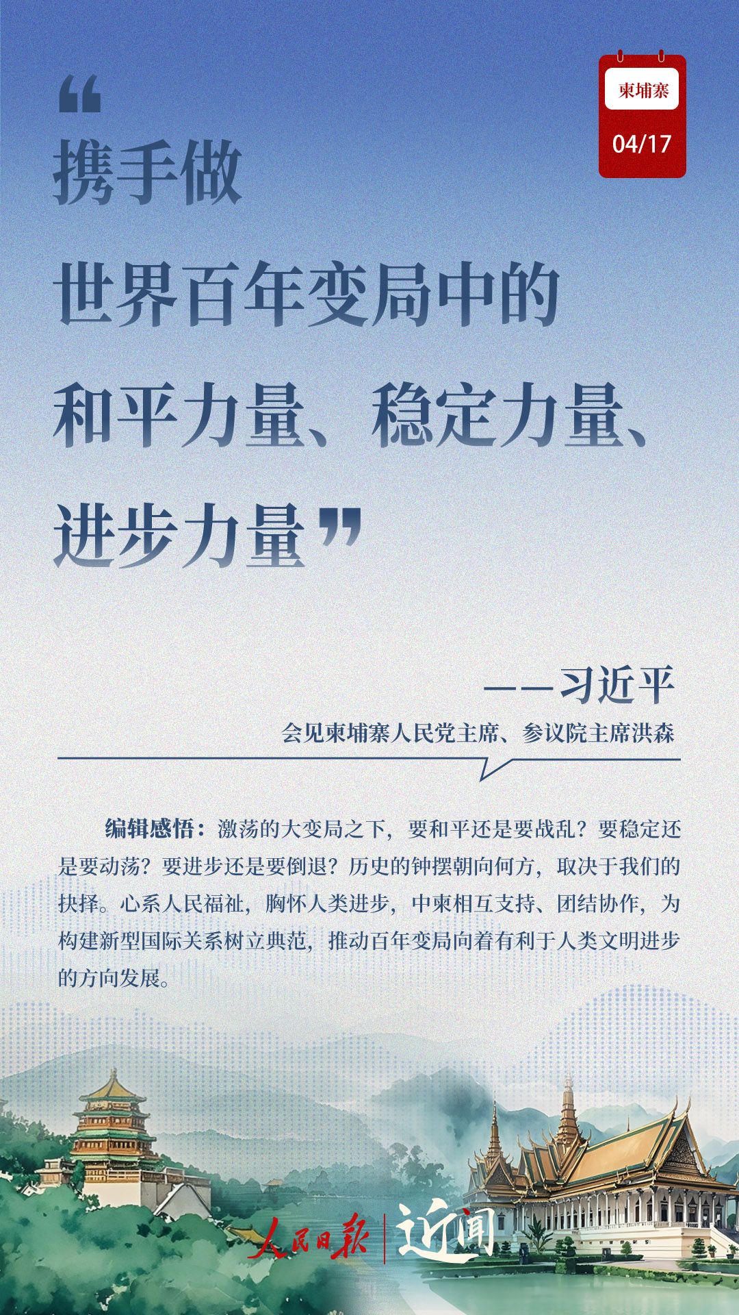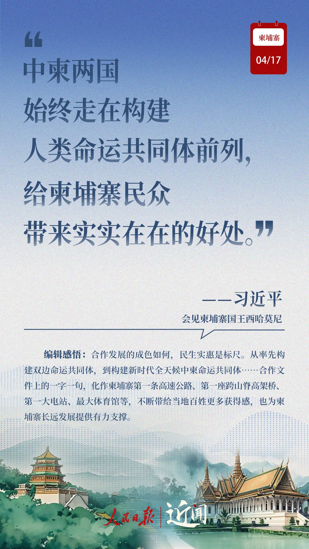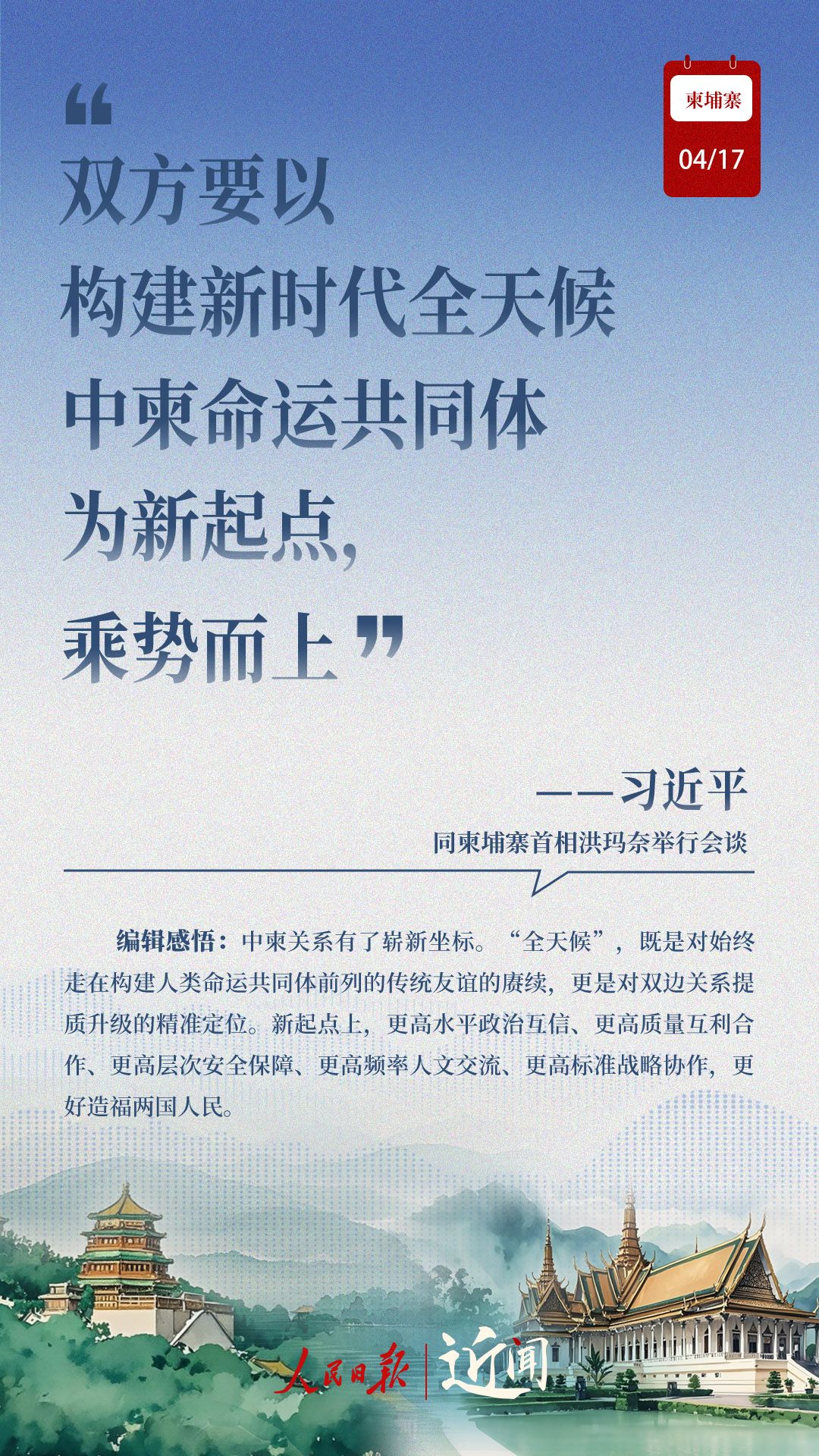 “古交如真金,百炼色不回。”从两国老一辈领导人亲手缔造和培育两国友好,到率先构建双边命运共同体,再到构建新时代全天候中柬命运共同体,中柬关系新定位水到渠成。