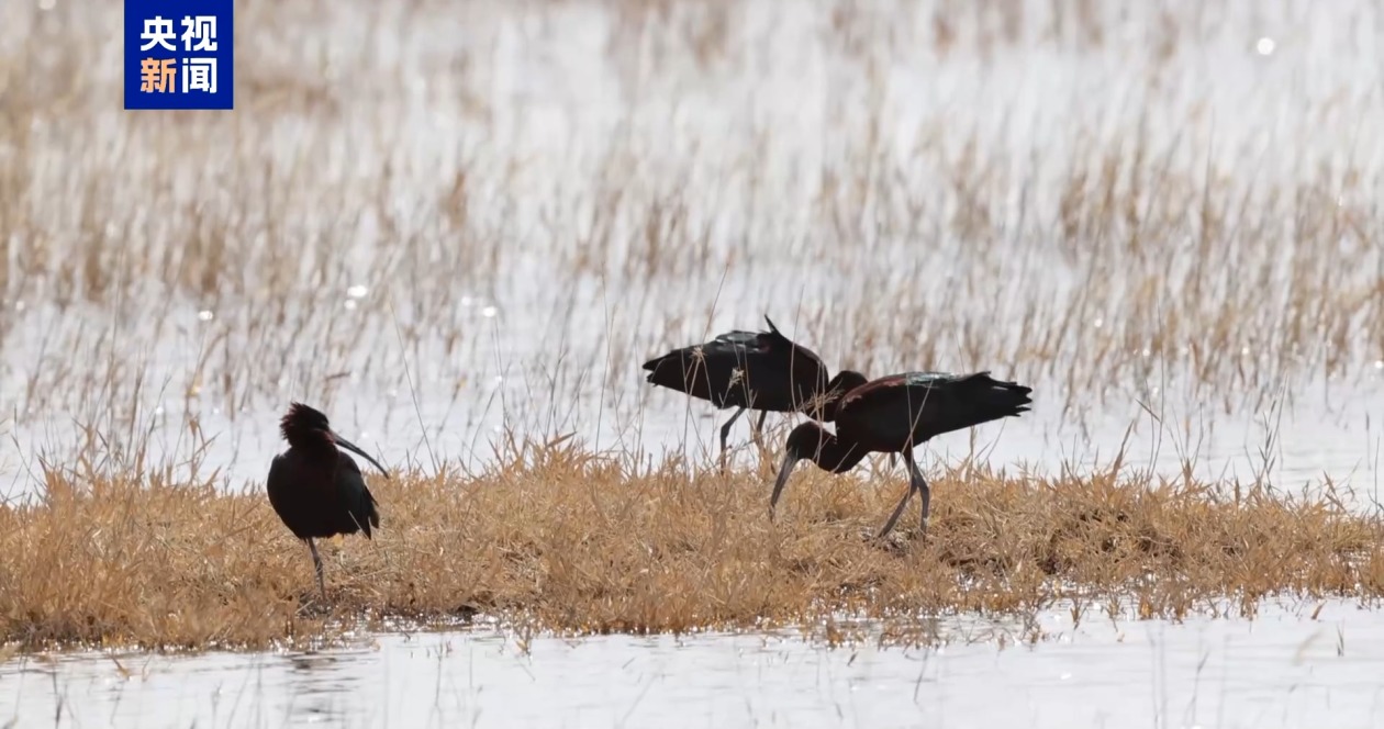监控画面中,4只身披金属光泽羽毛的彩鹮正在浅水区低头觅食,舒展的羽翼在阳光下折射出青铜色与紫绿色的变幻光彩。彩鹮对栖息地要求严苛,对水质、食物链的高要求,使其成为湿地健康的“活体检测仪”,曾于20世纪末在中国境内濒临绝迹。