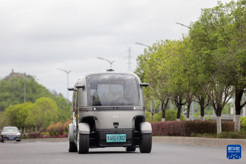 4月24日,无人驾驶公交车在贵阳市花溪大学城公交车站附近行驶。 新华社记者 刘续 摄