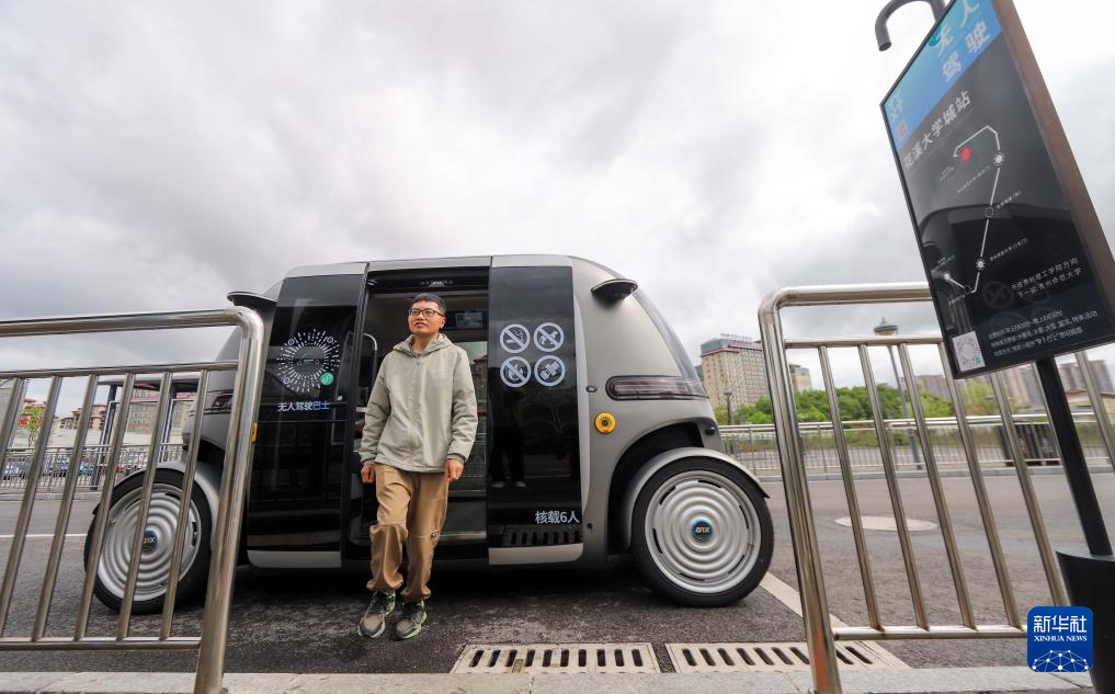 4月24日,参与体验活动的市民在贵阳市花溪大学城公交车站试乘无人驾驶公交车。 新华社记者 刘续 摄