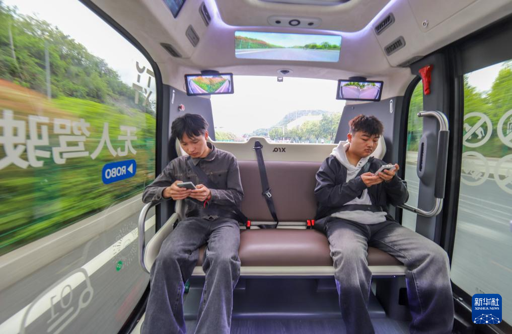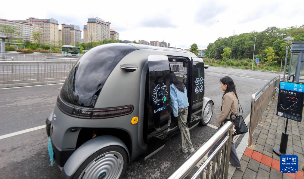 4月24日,参与体验活动的市民在贵阳市花溪大学城试乘无人驾驶公交车。 新华社记者 刘续 摄