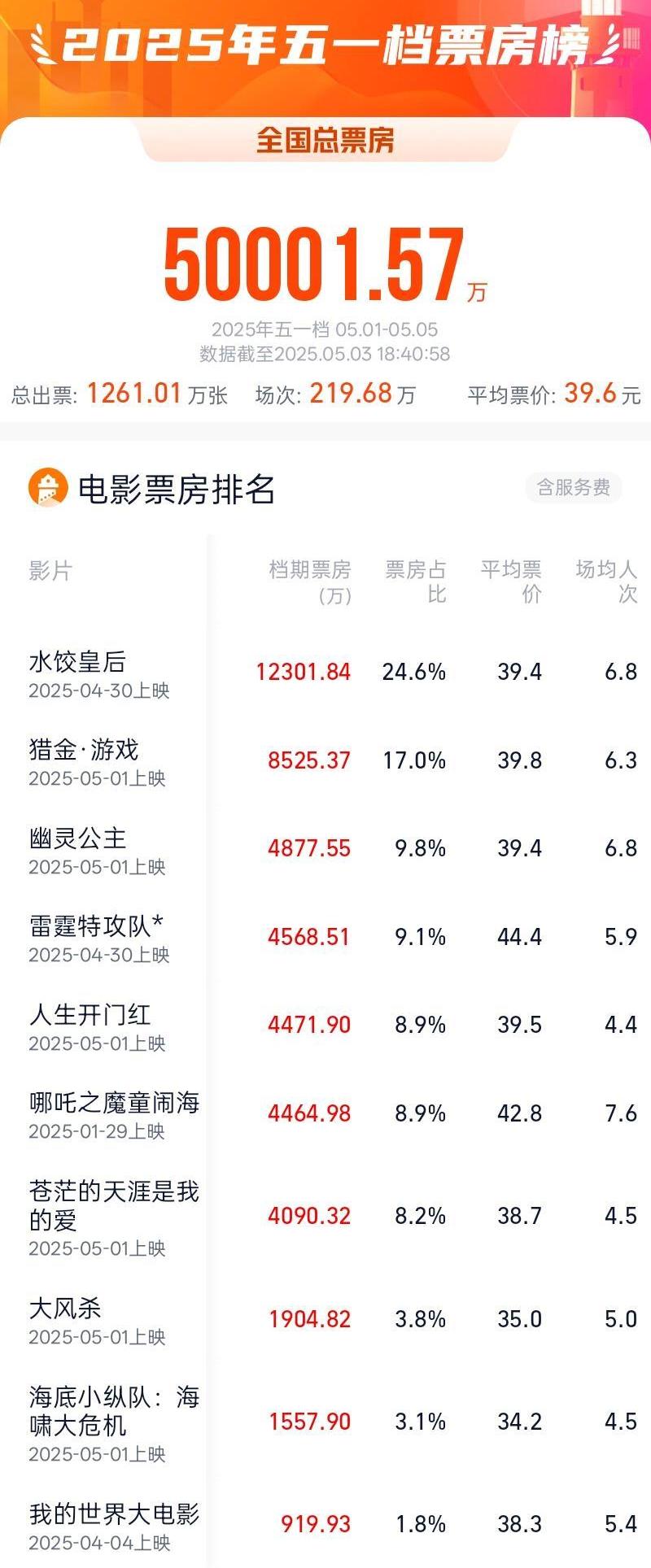 据网络平台数据,截至5月3日18时40分,2025年五一档(5月1日—5月5日)档期内总票房(含预售)突破5亿,影片《水饺皇后》《猎金·游戏》《幽灵公主》暂列前三名。