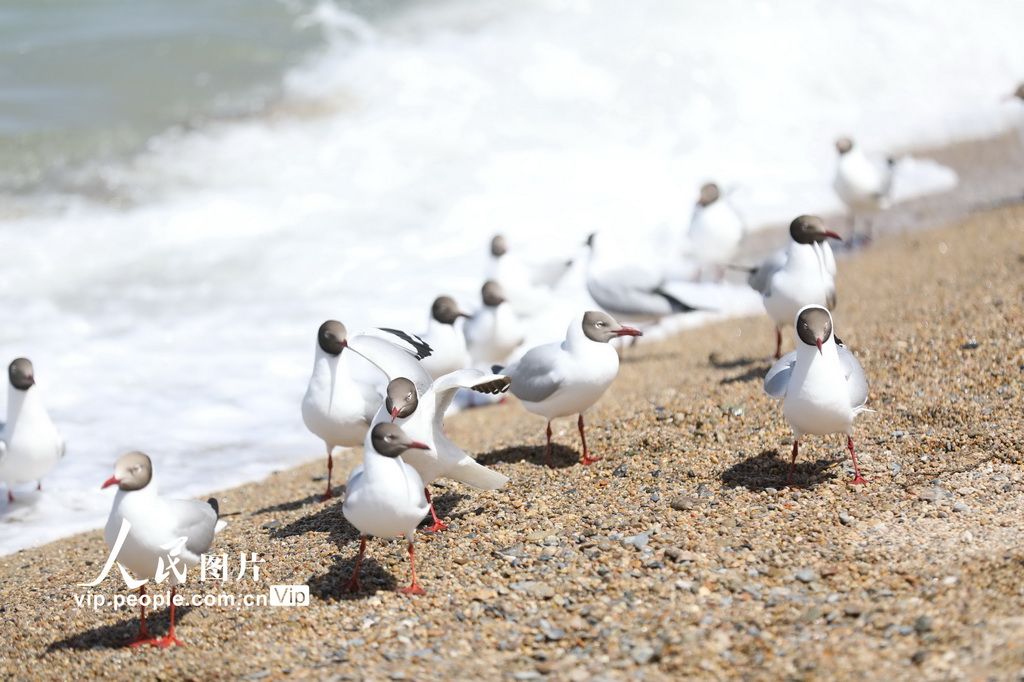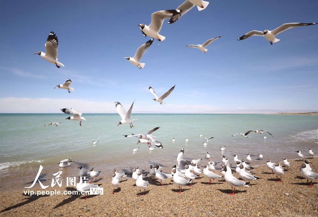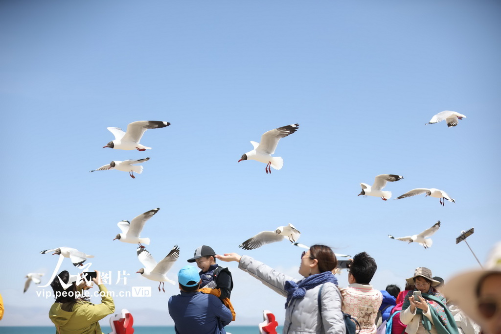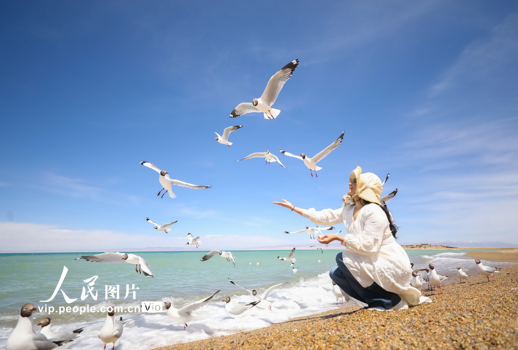 2025年5月5日,青海省海南藏族自治州共和县青海湖二郎剑景区,鸥鸟翔集,游客与鸥鸟欢乐互动。邹黎摄(人民图片网)