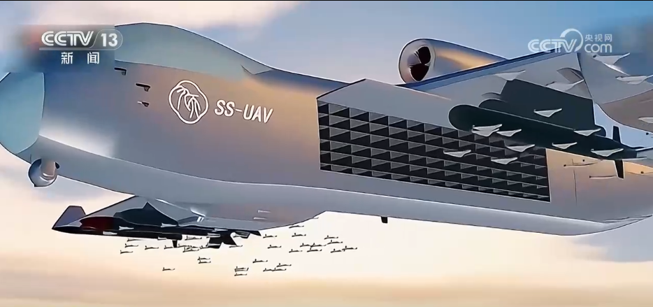 “九天”无人机的另一大亮点是在机腹内集成了神秘的“异构蜂巢任务舱”。这个任务舱可容纳上百枚巡飞弹或小型无人机,所以“九天”无人机也有“空中无人机航母”之称。