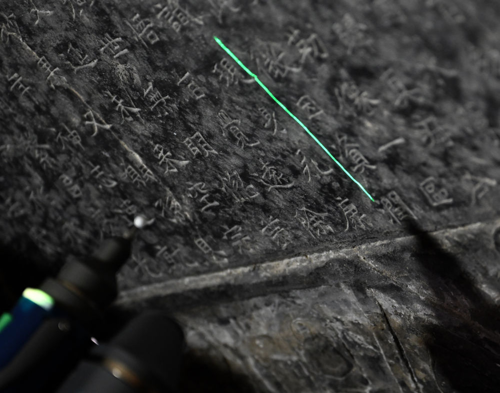 2025年4月9日,龙门石窟研究院工作人员在古阳洞使用关节臂扫描仪对《龙门二十品》之一进行数字化扫描。新华社记者 李嘉南 摄