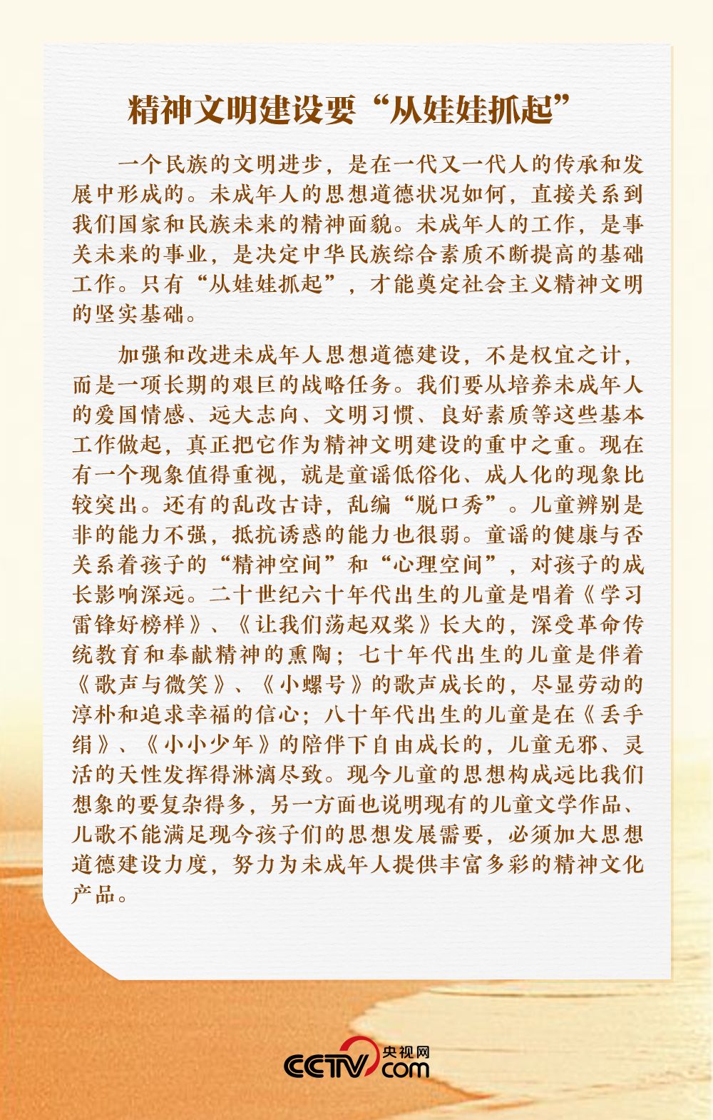 他态度鲜明,清晰阐述了“加强和改进未成年人思想道德建设”之于“精神文明建设”的重要性,直言只有“从娃娃抓起”,才能奠定社会主义精神文明的坚实基础。