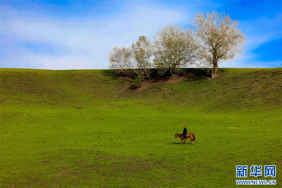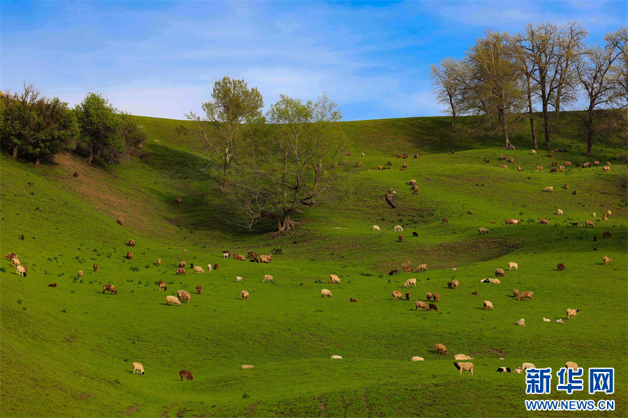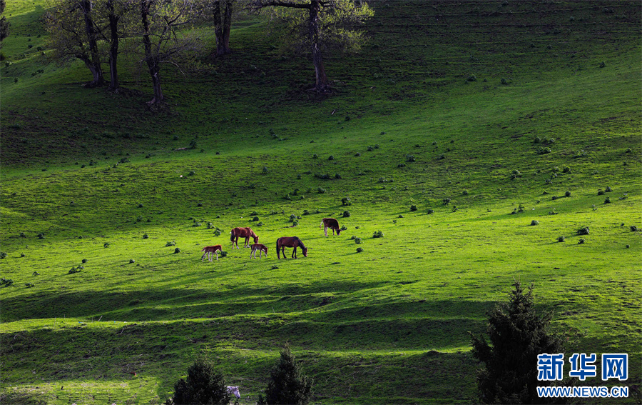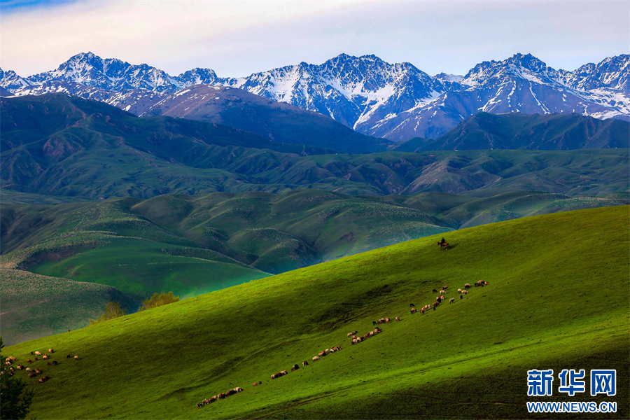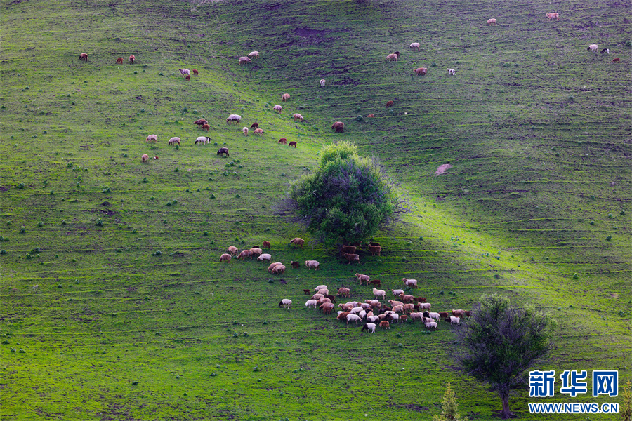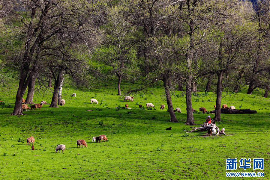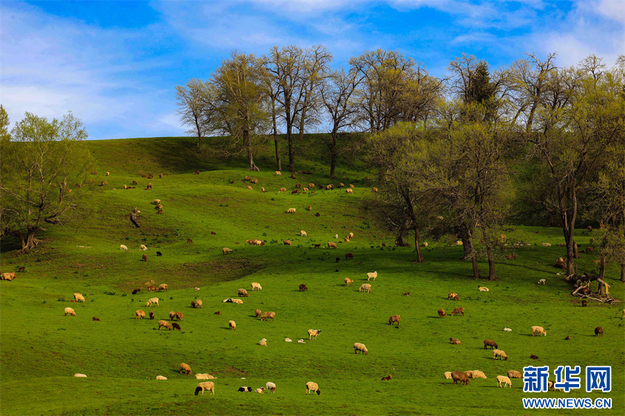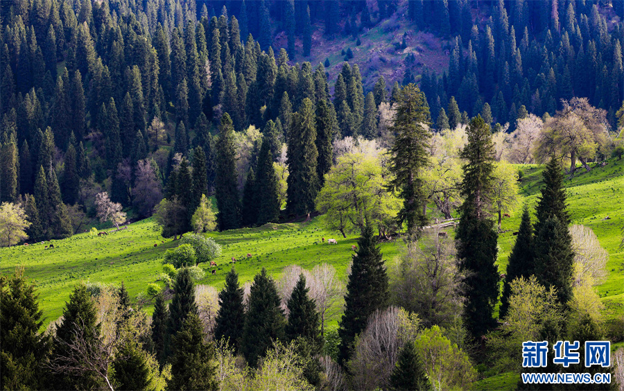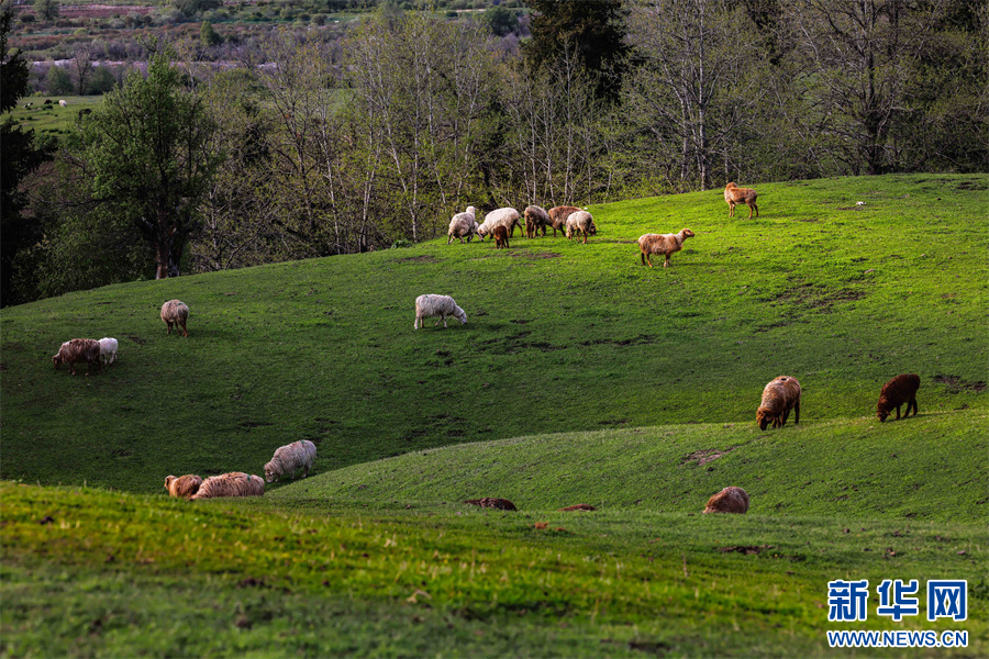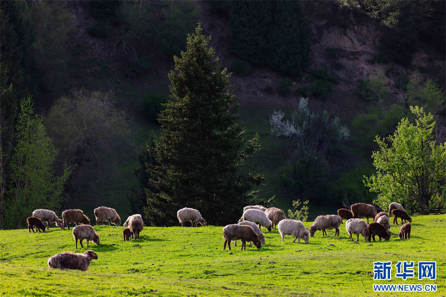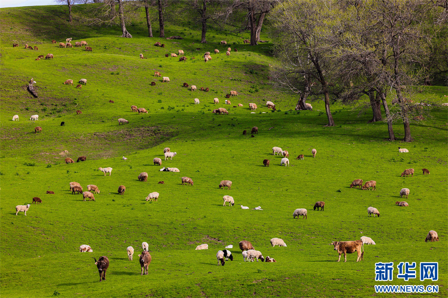 初夏时节,新疆新源县那拉提盘龙谷中,茵茵牧草铺满山谷,宛如绿色的地毯。成群的牛羊悠然自得地漫步其中,低头啃食着鲜嫩的牧草,构成了一幅和谐自然的田园牧歌图。