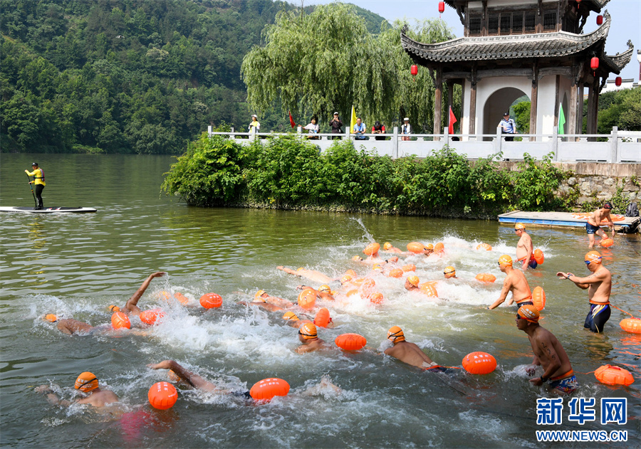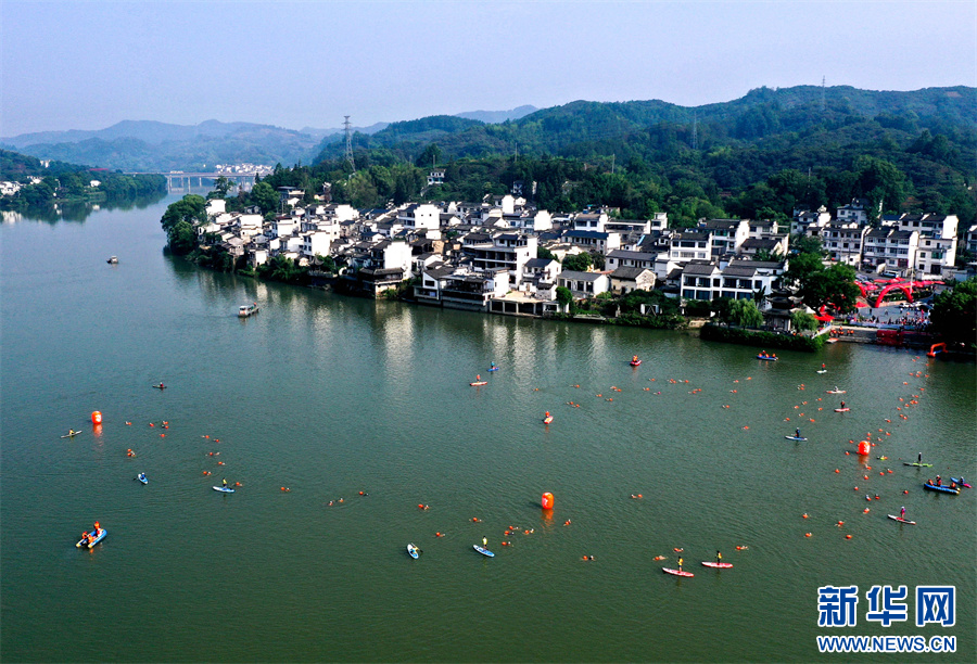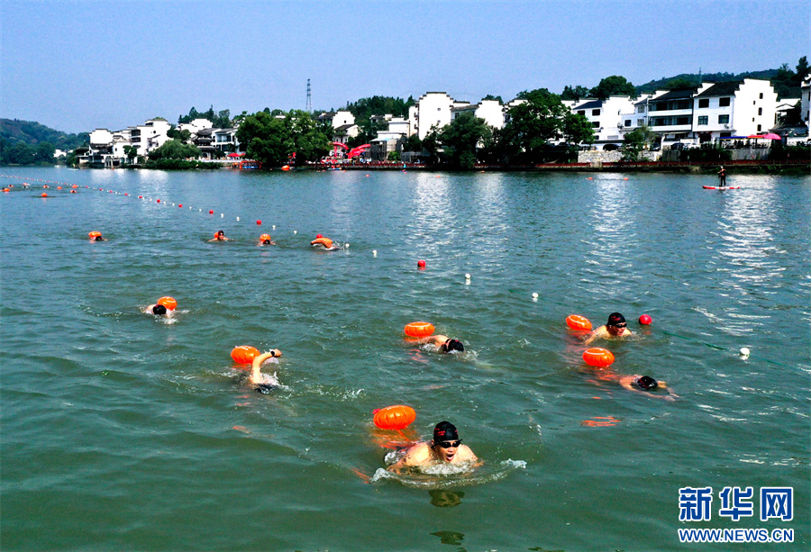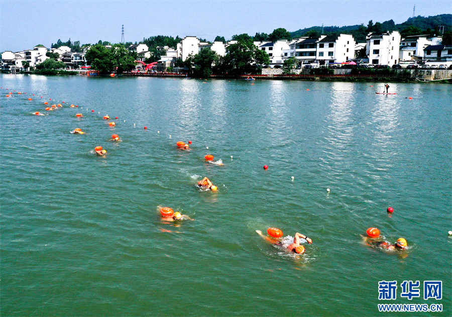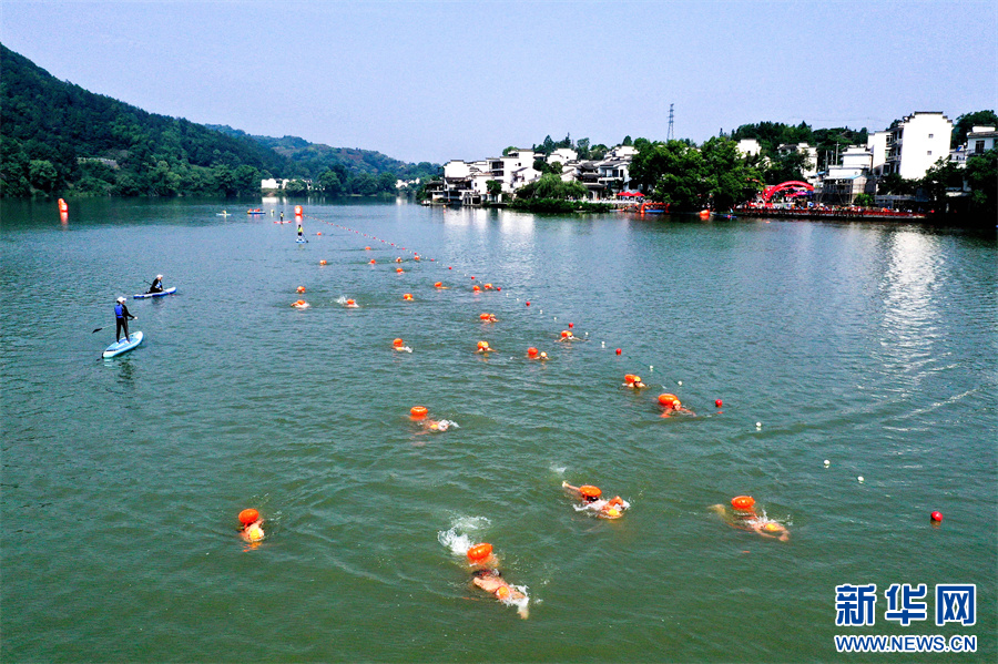 5月27日,参赛选手在2025长三角黄山(歙县)新安江公开水域游泳邀请赛中比拼。