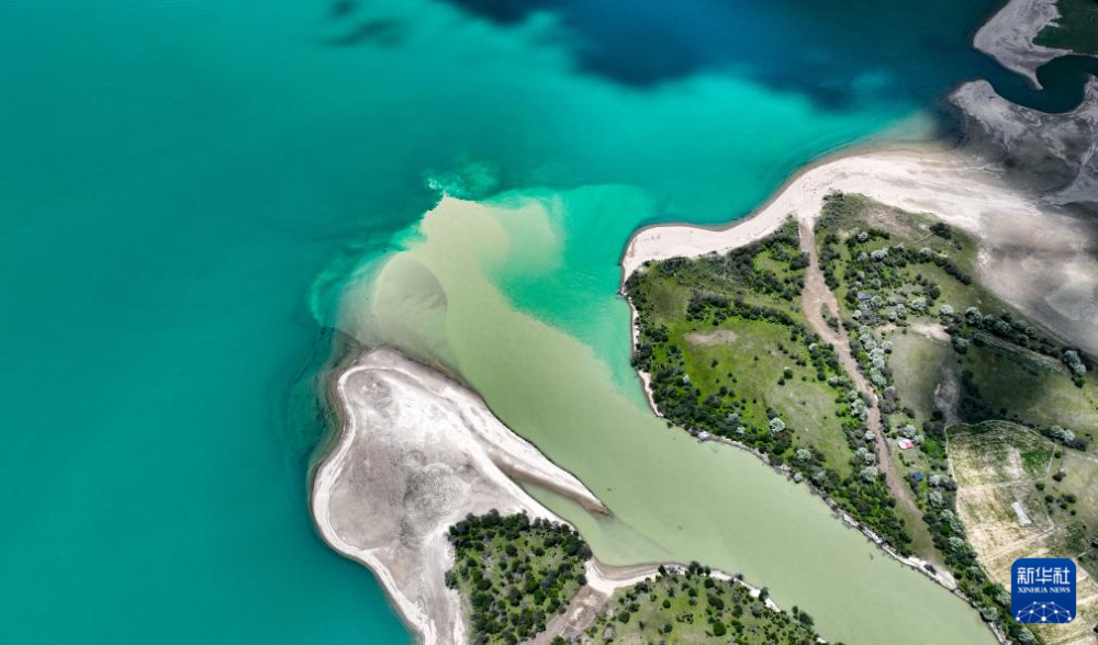 雪山环抱的巴松措(5月28日摄,无人机照片)。