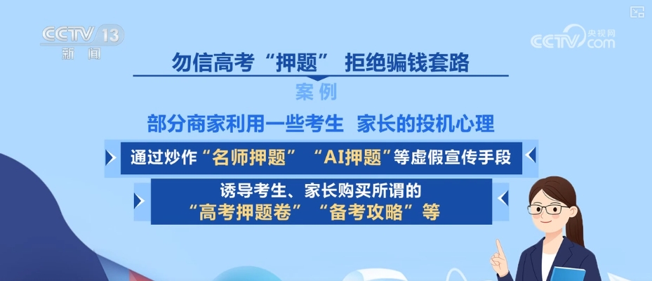 部分商家利用一些考生、家长的投机心理,通过炒作“名师押题”“AI押题”等虚假宣传手段,诱导考生、家长购买所谓的“高考押题卷”“备考攻略”等。甚至,还有不法分子通过制作钓鱼网站,用发短信、网页弹窗等方式出售所谓的“高考真题和答案”,一旦点击后就会以“预付订金”等名义要求付款。
