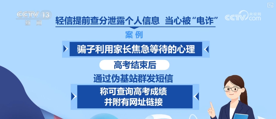 骗子利用家长焦急等待的心理,高考结束后,通过伪基站群发短信,称可查询高考成绩,并附有网址链接。考生收到此类信息后,点开网址链接,导致手机被植入盗取网银的木马软件,或者要求输入姓名、身份证号、手机号、银行账号等信息,被不法分子用于实施电信诈骗。