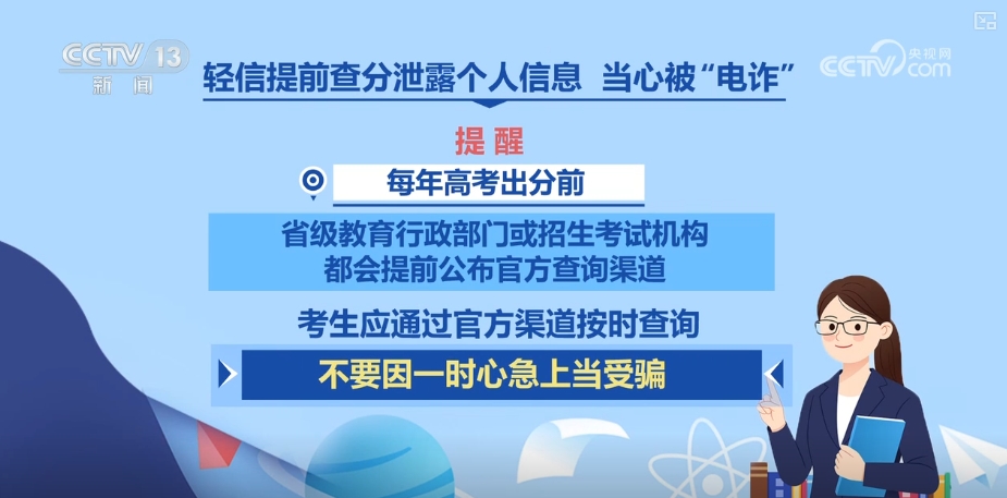 每年高考出分前,省级教育行政部门或招生考试机构都会提前公布官方查询渠道,考生应通过官方渠道按时查询,不要因一时心急上当受骗。
