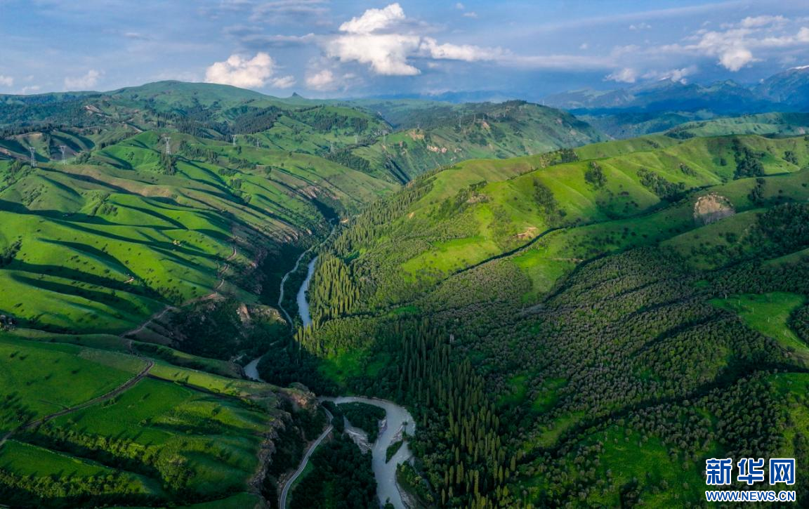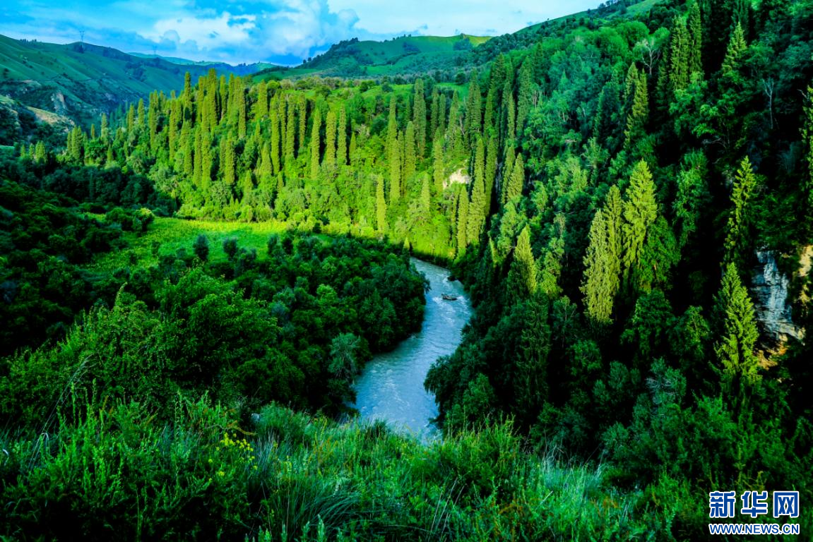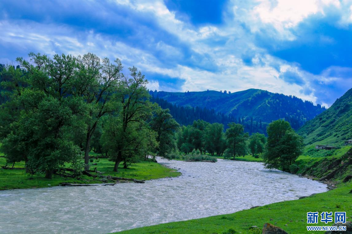 瞧那林间,哈萨克族白毡房静静伫立,似是在守护这片宁静。不远处,一条河流蜿蜒而过,河水潺潺,在阳光的照耀下闪烁着细碎的光芒,与周围郁郁葱葱的树木相映成趣,宛如一幅灵动的山水画卷。