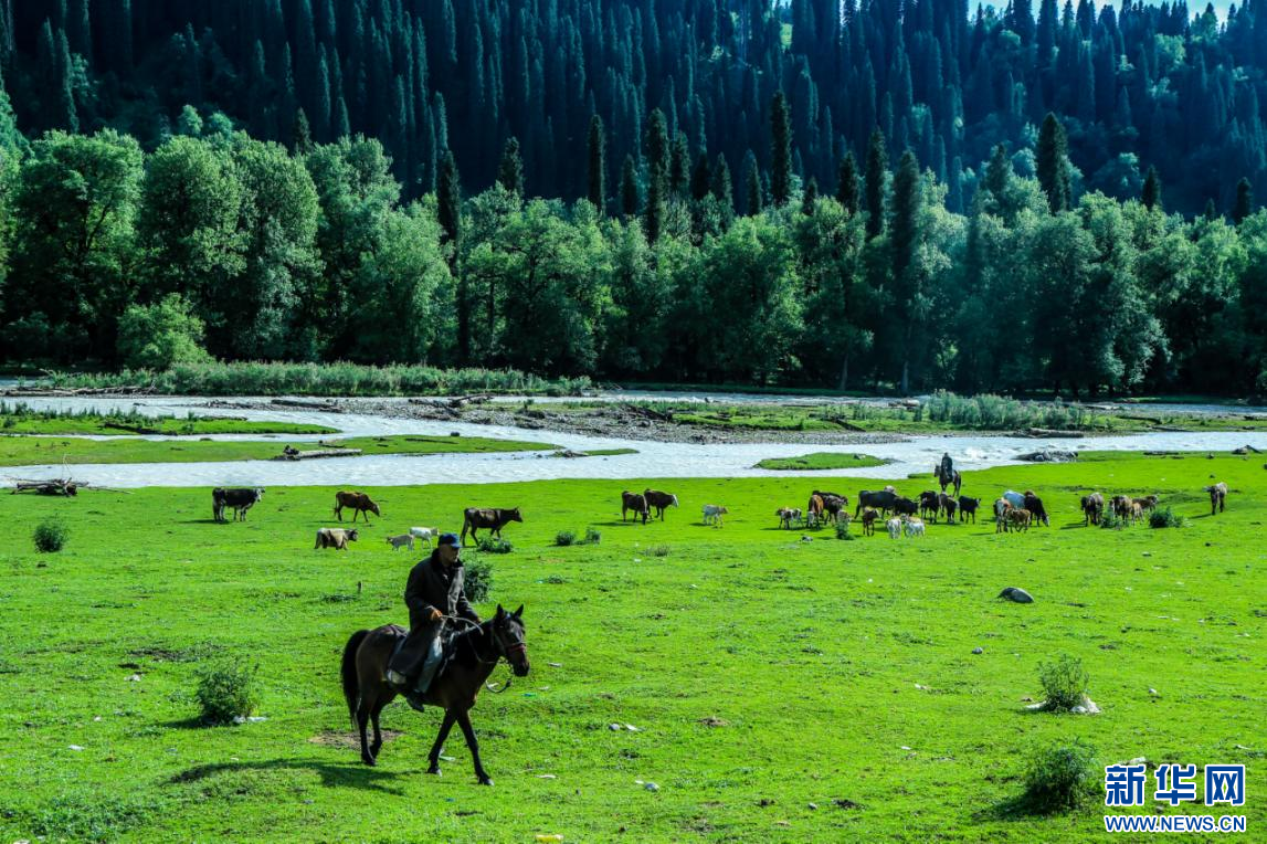 极目远眺,山坡被茂密的森林覆盖,树木高大挺拔,绿意逼人。山脚下,广阔的草原如绿色绒毯般铺展。牛马成群或悠然漫步,或低头吃草,自在惬意。牧民骑着马,身姿矫健,守护着这片牧场,传递着一种古朴而纯粹的生活气息。