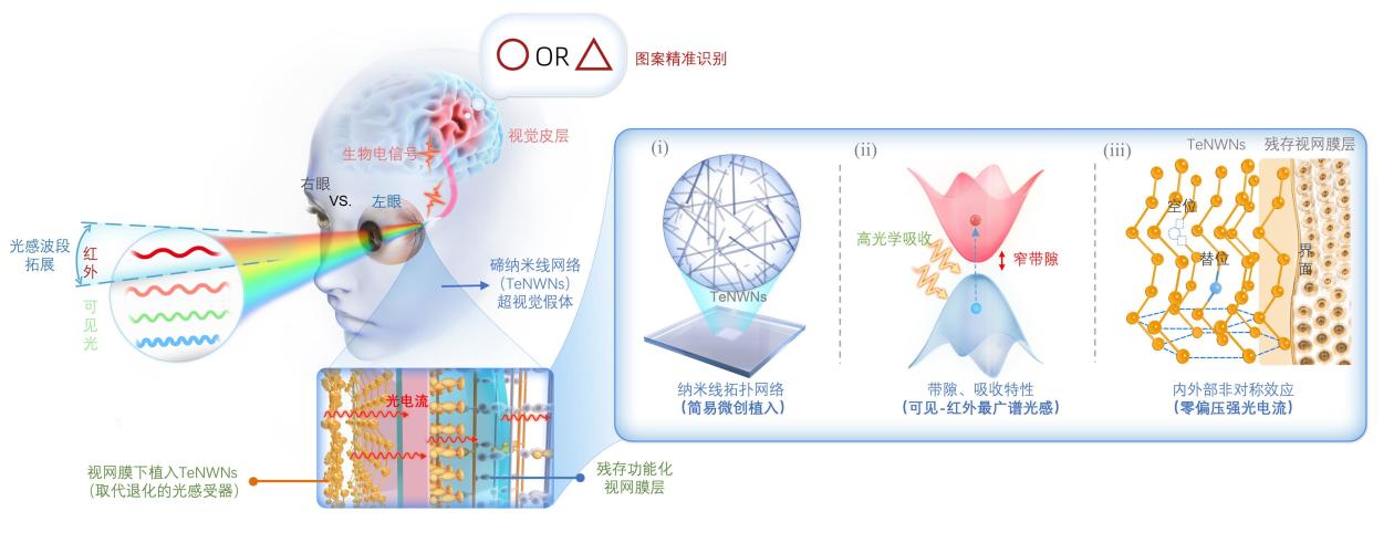 该假体由碲纳米线网络(TeNWNs)制成,植入眼底后,可替代凋亡的感光细胞接收光信号,并将其转化为电信号激活视网膜上尚存活的神经细胞。
