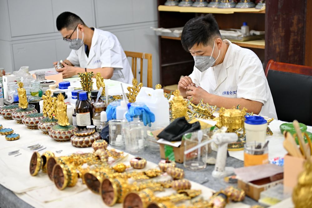 2025年5月30日,文保工作人员在承德避暑山庄博物院修复珐琅器。