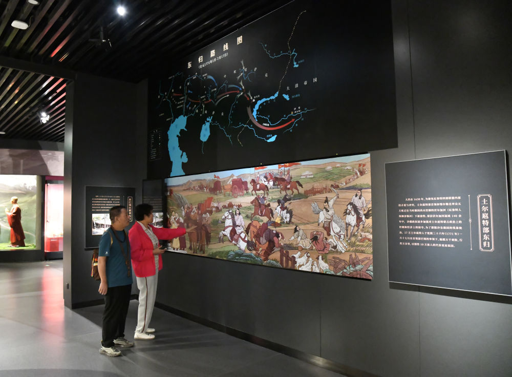 2025年6月4日,游客在承德博物馆参观土尔扈特部东归的示意图。2021年,习近平总书记在承德博物馆考察期间曾感慨:“土尔扈特部都去了100多年了,最终还是义无反顾要回到祖国,这真正体现了我们中华民族的影响力和向心力。”