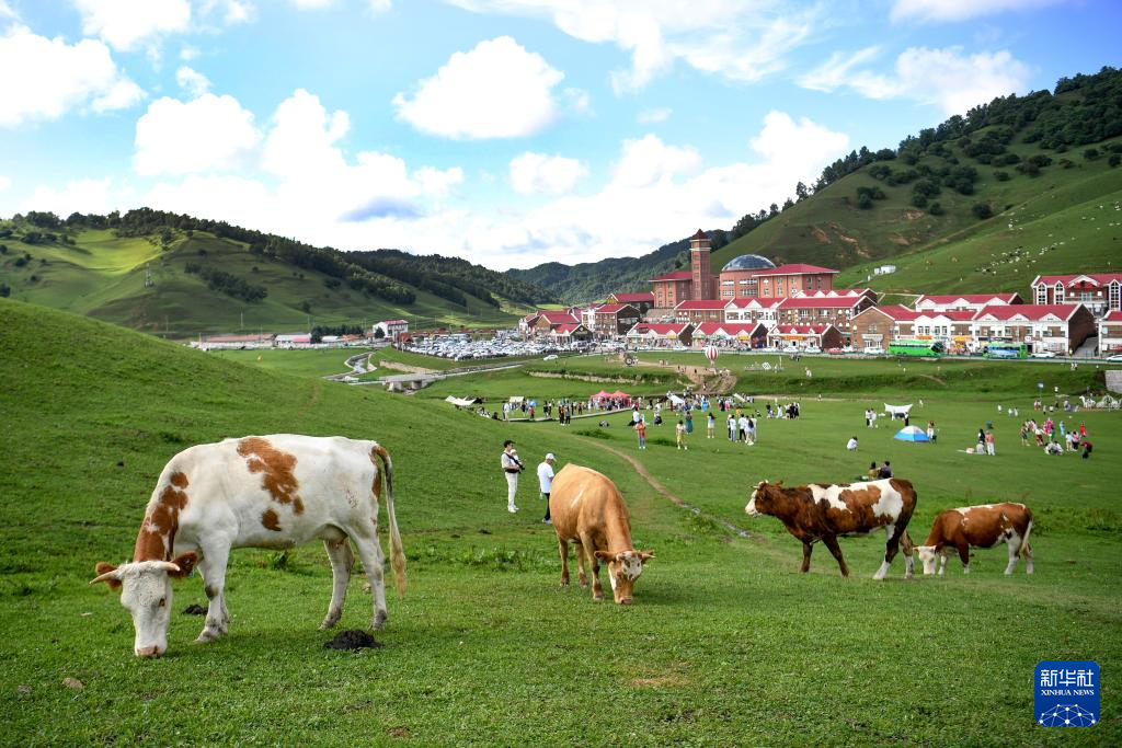 游客在位于宝鸡市陇县的关山草原景区游览(2024年8月3日摄)。