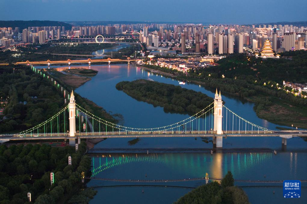 宝鸡市区渭河沿岸夜景(无人机照片,2024年5月9日摄)。