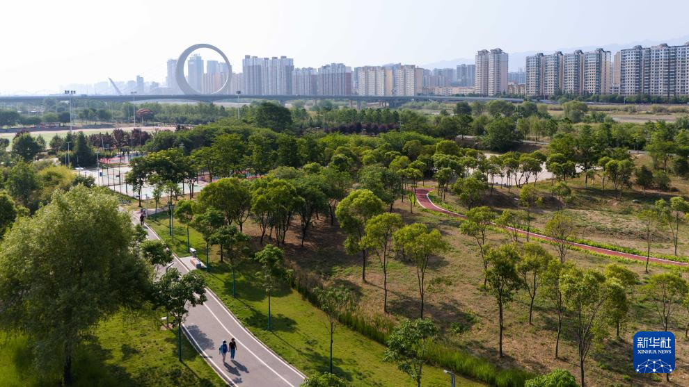 宝鸡市区渭河沿岸建设的运动休闲空间(无人机照片,2024年5月9日摄)。