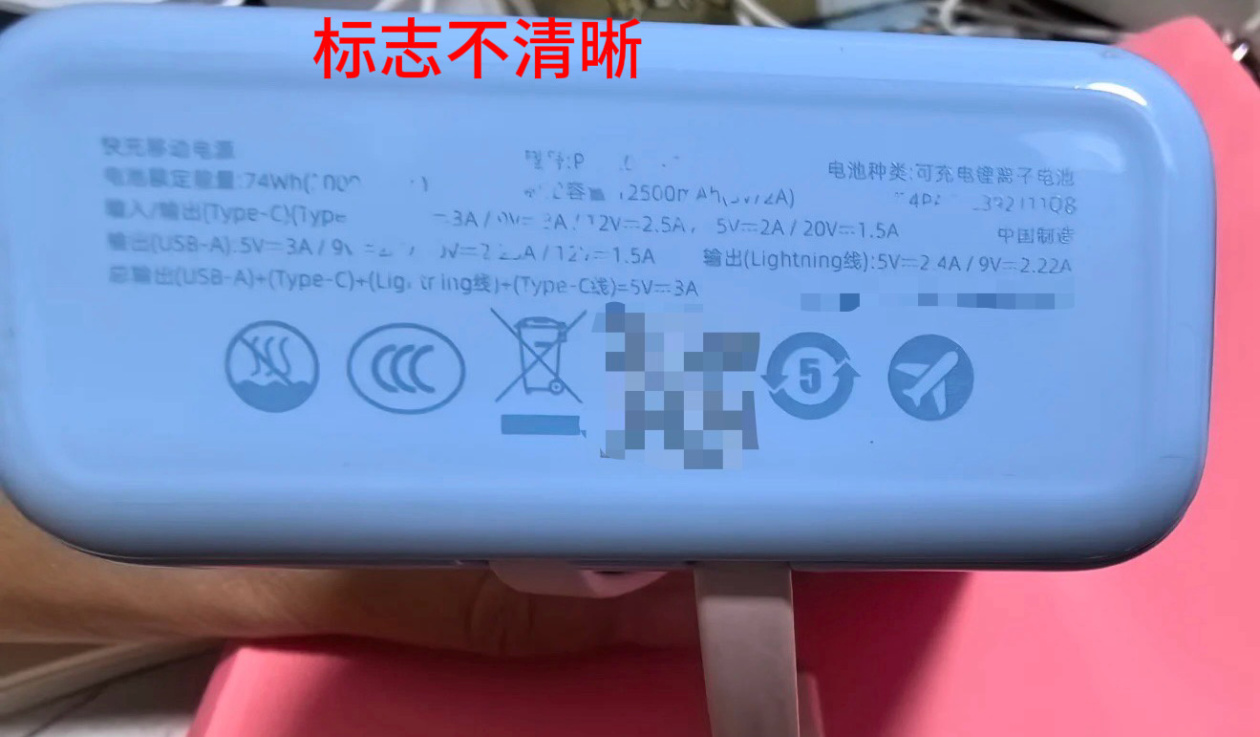 标识:旅客禁止携带没有3C标识、3C标识不清晰的充电宝乘坐境内航班。
