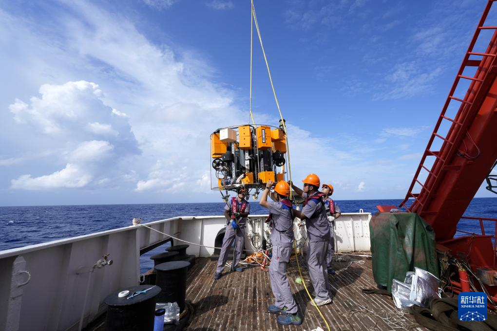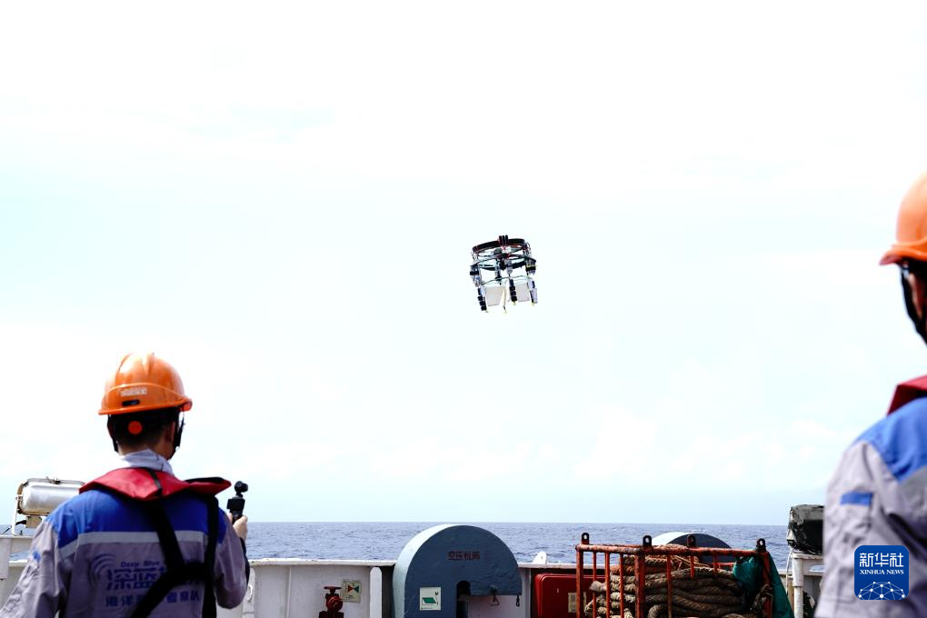 7月8日,科研人员将无人潜器吊运入海开展科考试验。新华社记者 张建松 摄