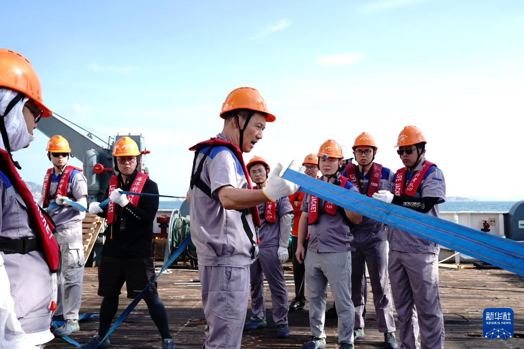 7月8日,“深蓝智能i3航次”首席科学家、南方科技大学海洋高等研究院院长、讲席教授林间(中)在“向阳红10”号指导科考安全工作。新华社记者 张建松 摄