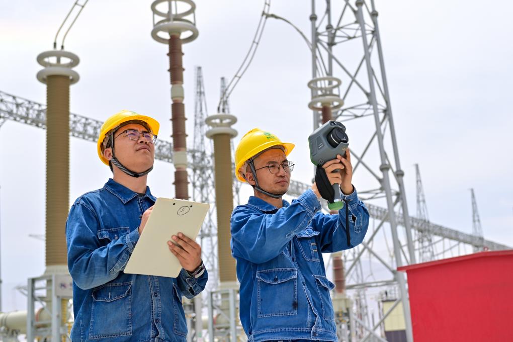 在新疆环塔里木盆地750千伏输变电工程若羌750千伏变电站,运检人员检测设备温度(6月27日摄)。新华社记者 丁磊 摄