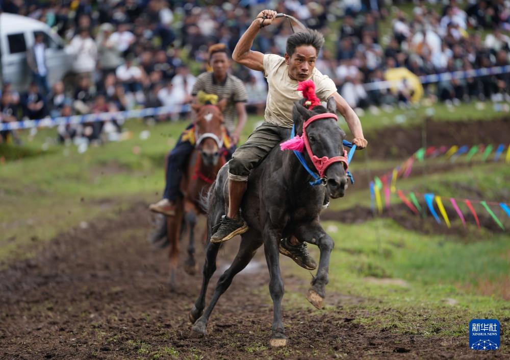 当地彝族群众在布拖县龙潭镇包谷坪火把场参加赛马(7月21日摄)。