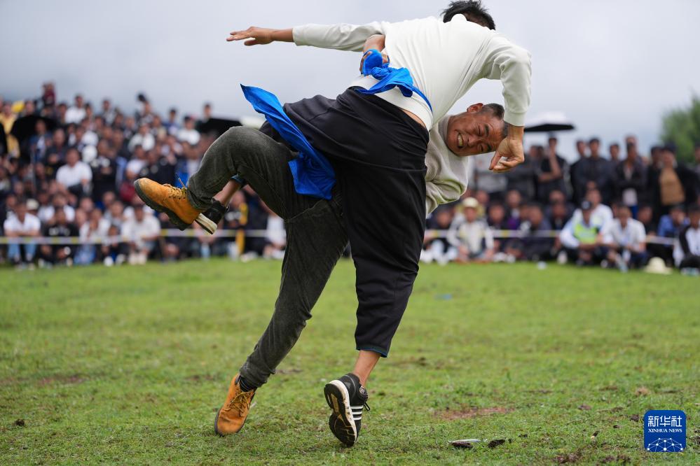 在布拖县龙潭镇包谷坪火把场举行的彝族传统摔跤比赛(7月21日摄)。