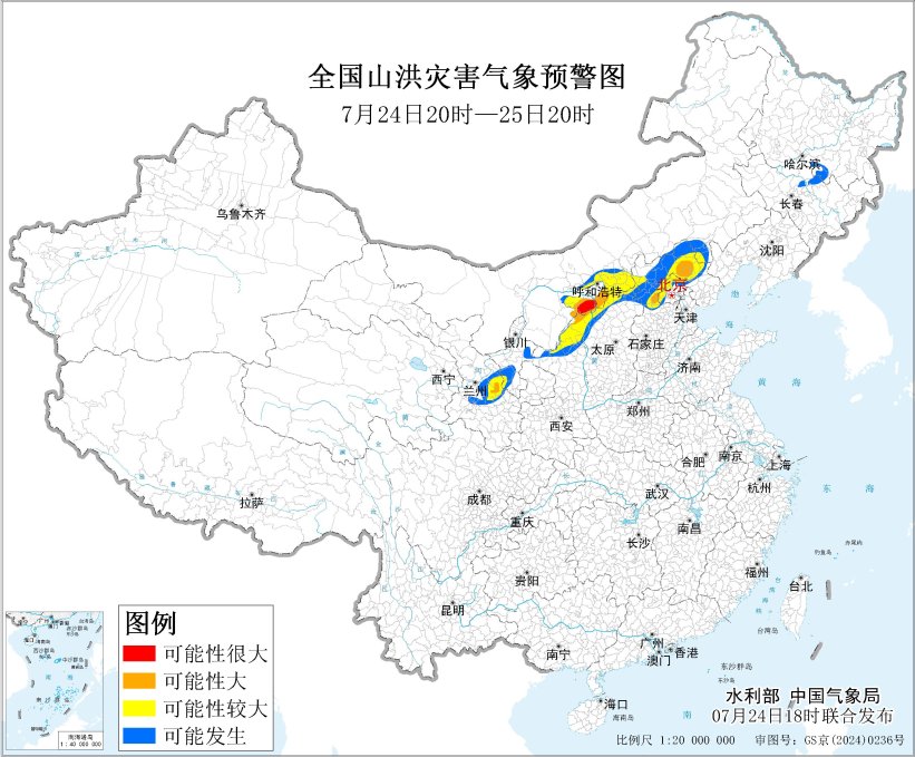 央视网消息:水利部和中国气象局7月24日18时联合发布红色山洪灾害气象预警:预计,7月24日20时至25日20时,北京西部、河北北部、内蒙古中部、甘肃东部等地部分地区发生山洪灾害可能性大(橙色预警),其中,内蒙古中部局地发生山洪灾害可能性很大(红色预警)。其他地区也可能因局地短历时强降水引发山洪灾害,请各地注意做好实时监测、防汛预警和转移避险等防范工作。