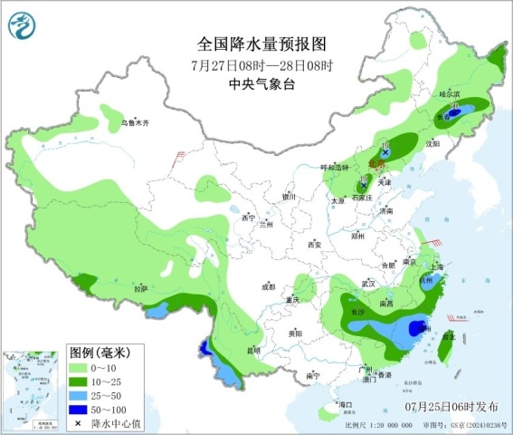 中央气象台今晨继续发布暴雨黄色预警:预计今天,内蒙古中东部偏南地区、甘肃东部、陕西北部、山西北部、河北西部和北部、北京北部、辽宁西部、吉林中部、黑龙江东南部以及四川盆地西南部、云南中部、浙江东部、台湾岛等地部分地区有大到暴雨,其中,内蒙古中部偏南地区、山西北部、吉林中部偏北地区、黑龙江东南部、台湾岛北部等地部分地区有大暴雨(100~150毫米)。上述部分地区伴有短时强降水(最大小时降雨量20~50毫米,局地可超过70毫米),局地有雷暴大风等强对流天气。